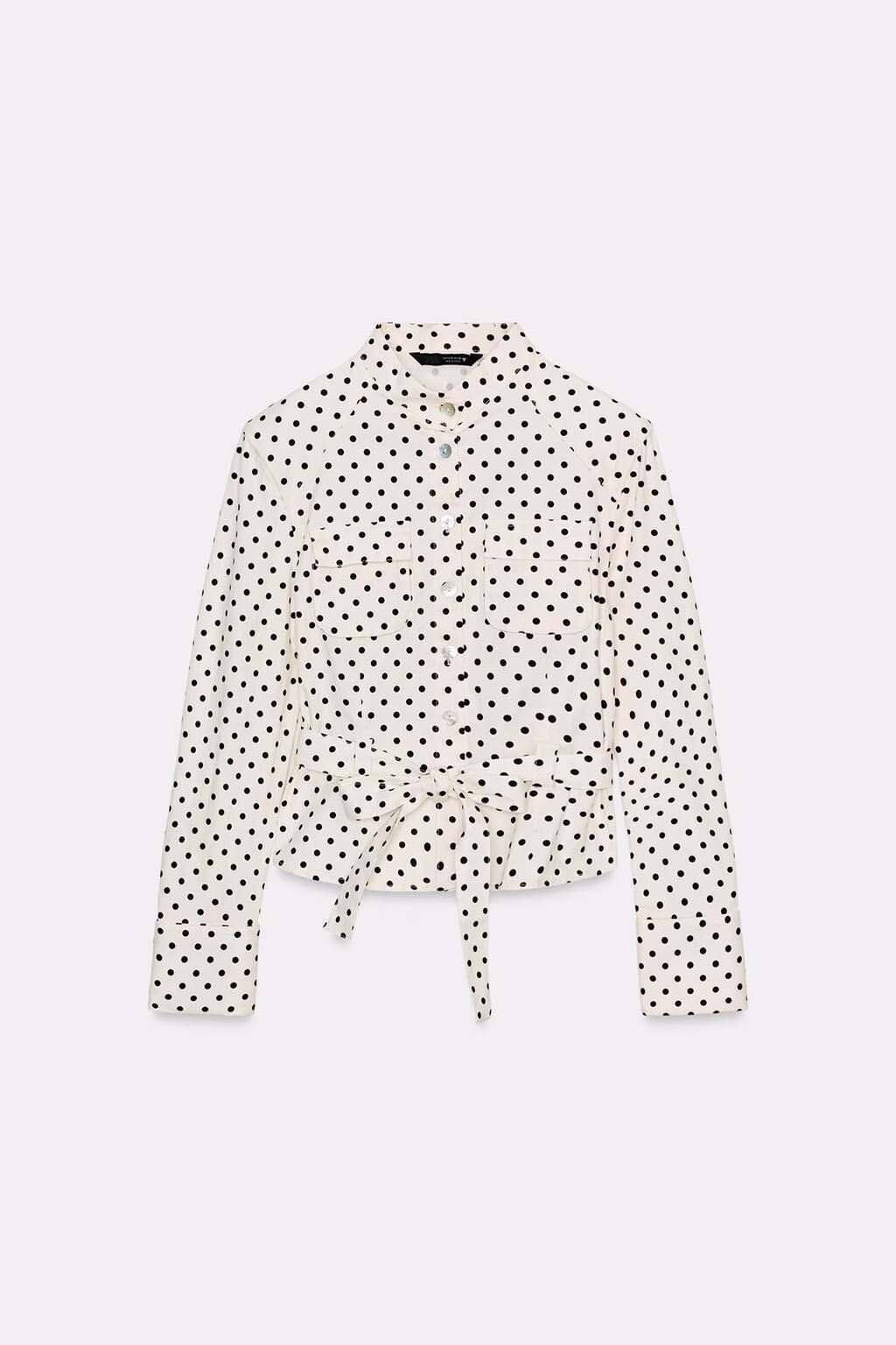 Polka dots are a “quiet print” that never goes wrong—they’ve appeared on designer runways from Miu Miu to Dior for decades. Tuck it into dark wash jeans with black thong heels, or layer it under the linen belted trench coat. The texture and mix of pattern with basics creates instant beauty.