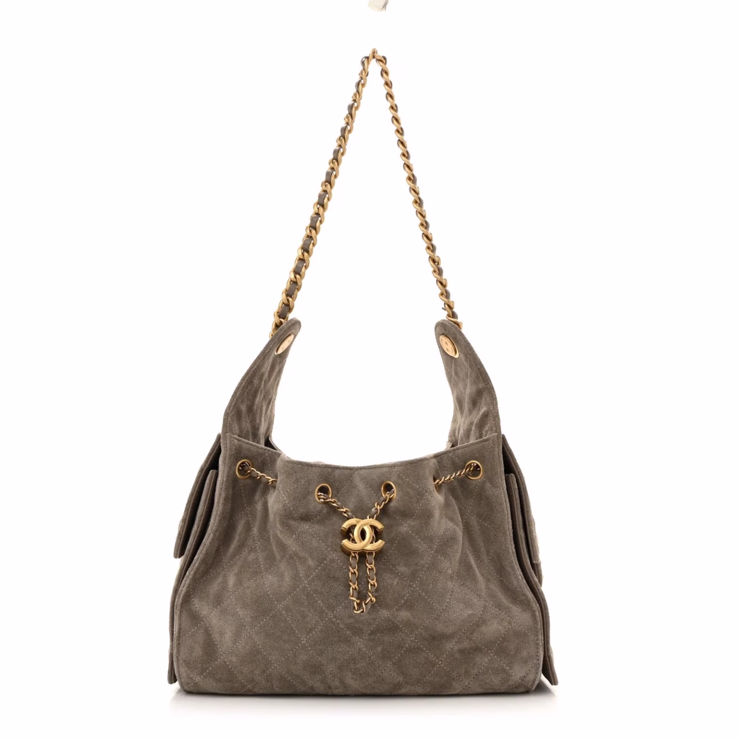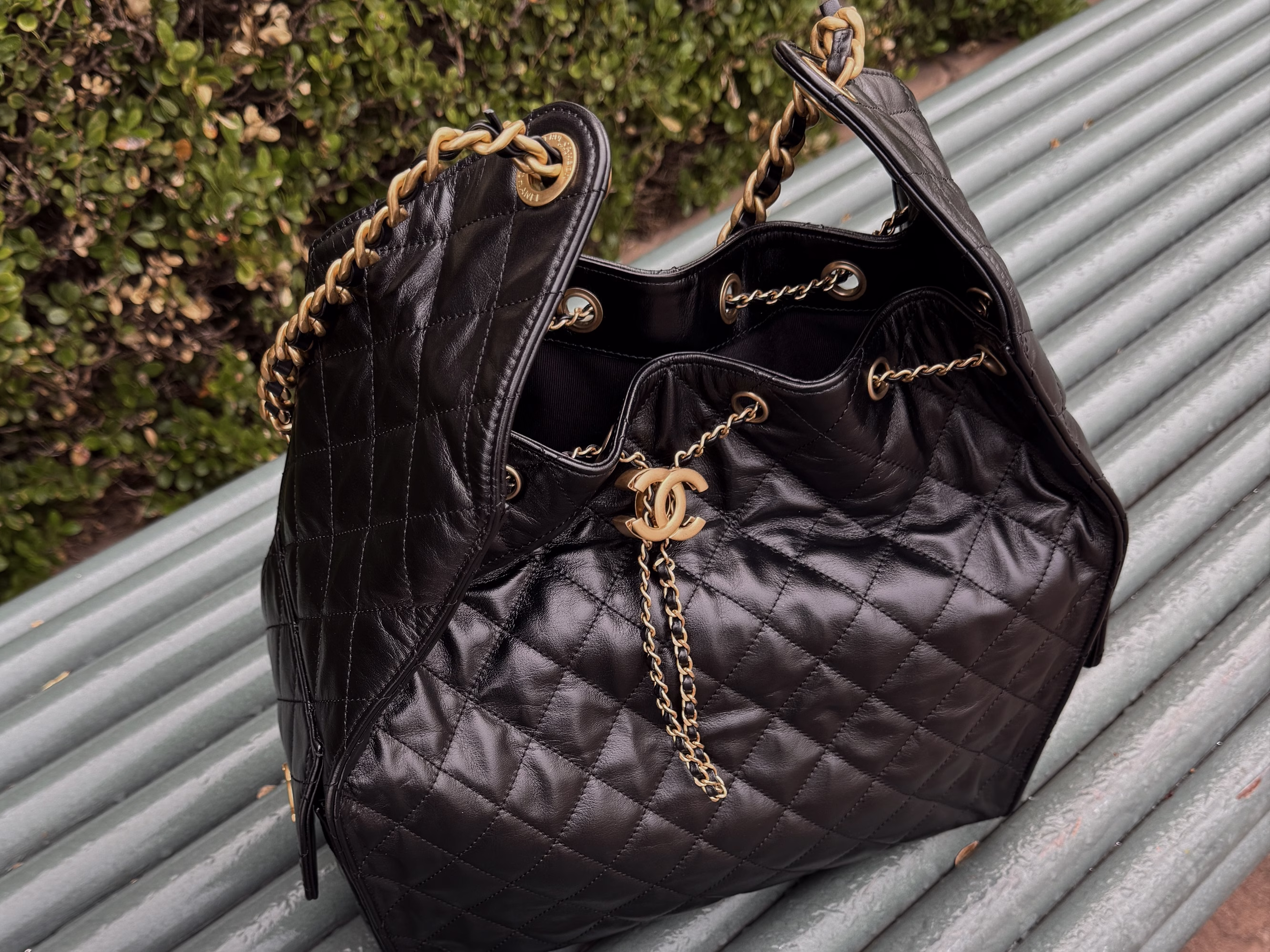 At its core, the Chanel 25 is a soft tote bag with a single leather-woven chain strap, two exterior cargo-style side pockets, and an open interior secured by a chain drawstring closure featuring the interlocking CC detail. The shape is best described as a slouchy hobo with a semi-structured base—it won’t collapse completely like the 22, but it maintains that relaxed, modern silhouette that resonates with current fashion world trends.