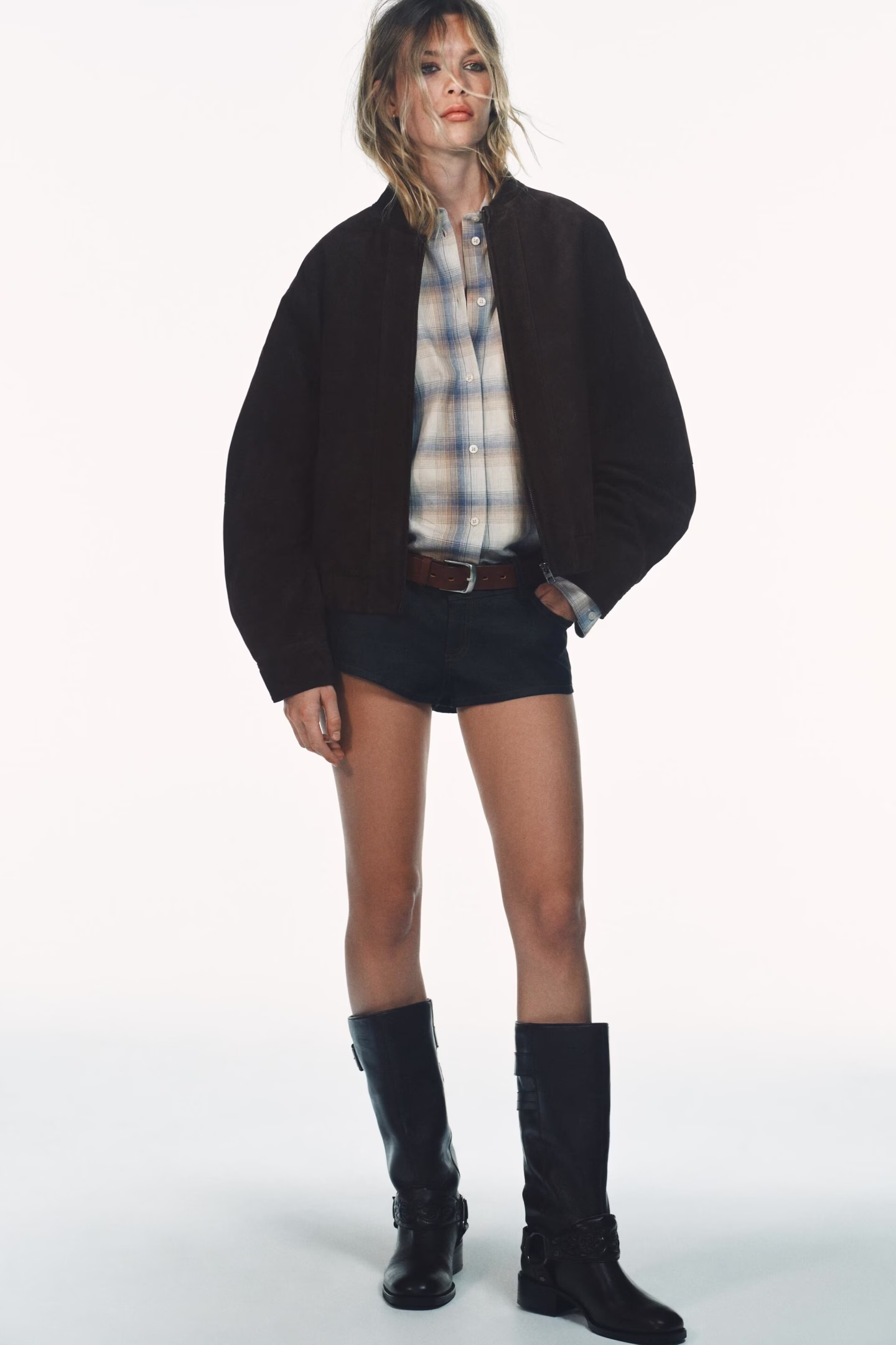 This look is more relaxed and slightly edgy: bomber jacket, oversized plaid shirt, low rise mini denim shorts, and leather cowboy boots. It’s perfect for cooler evenings or desert winds.