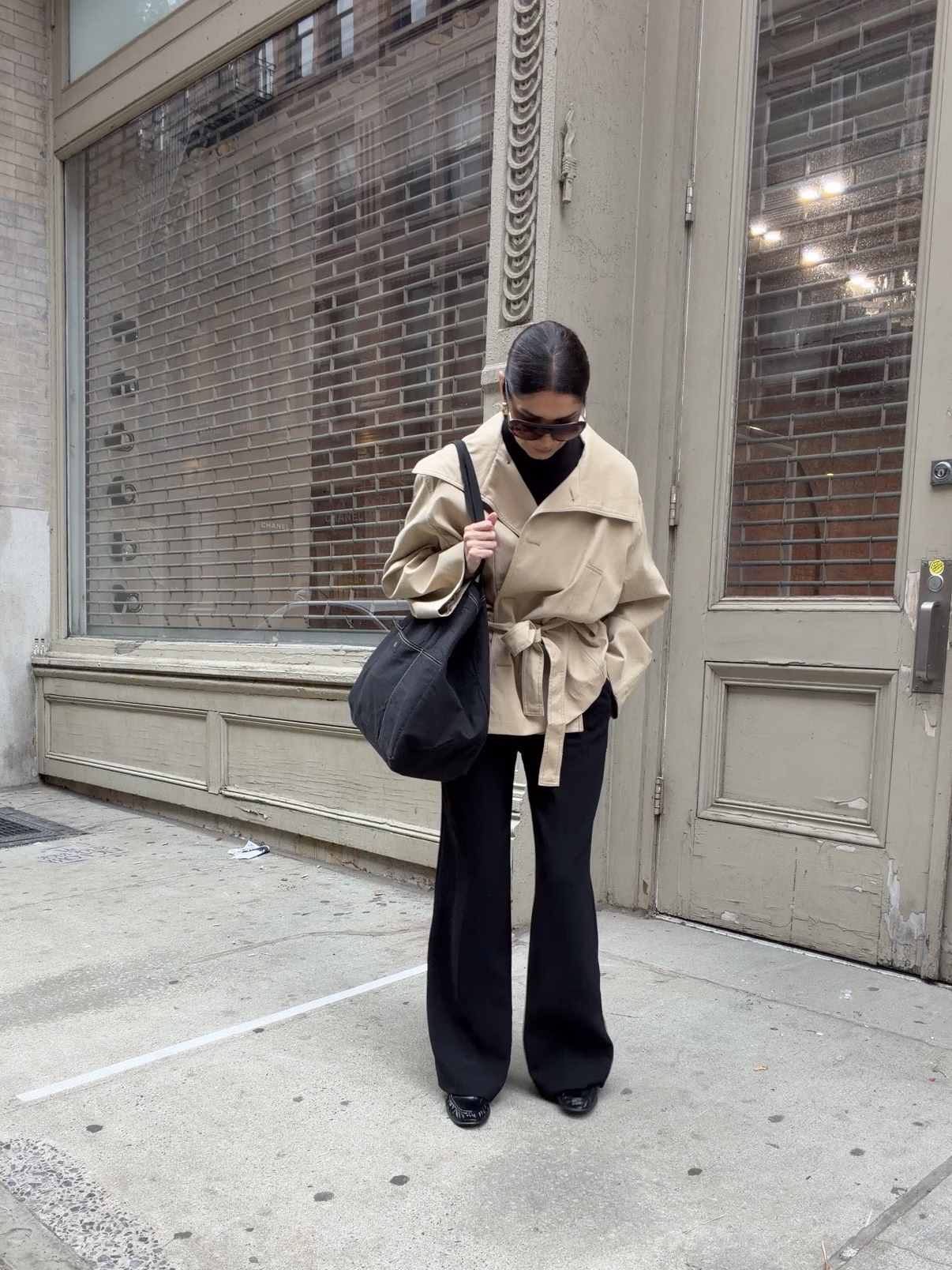 - My hero outfit is all-black: cropped trench, knit, tailored pants, and a simple bag.