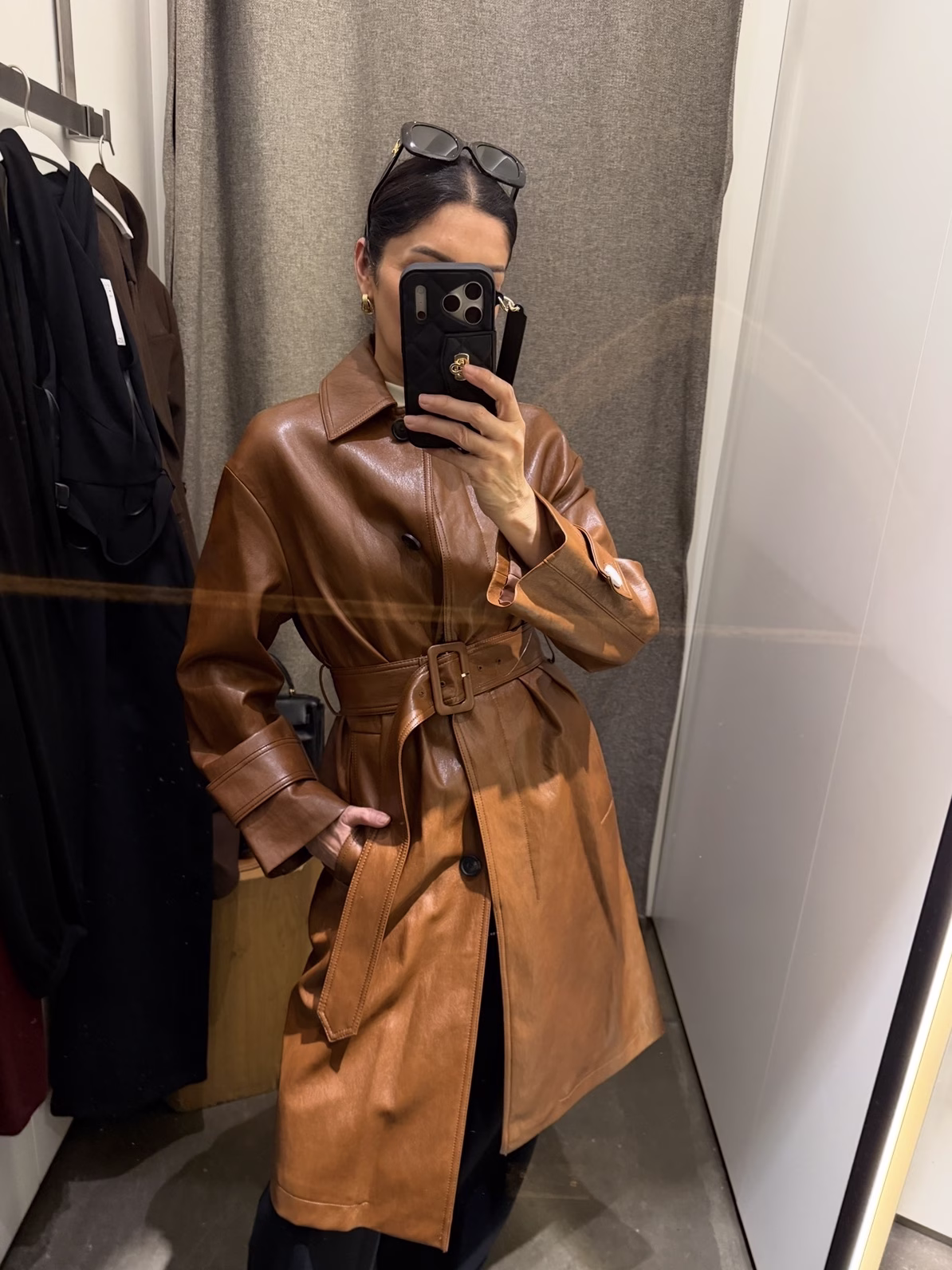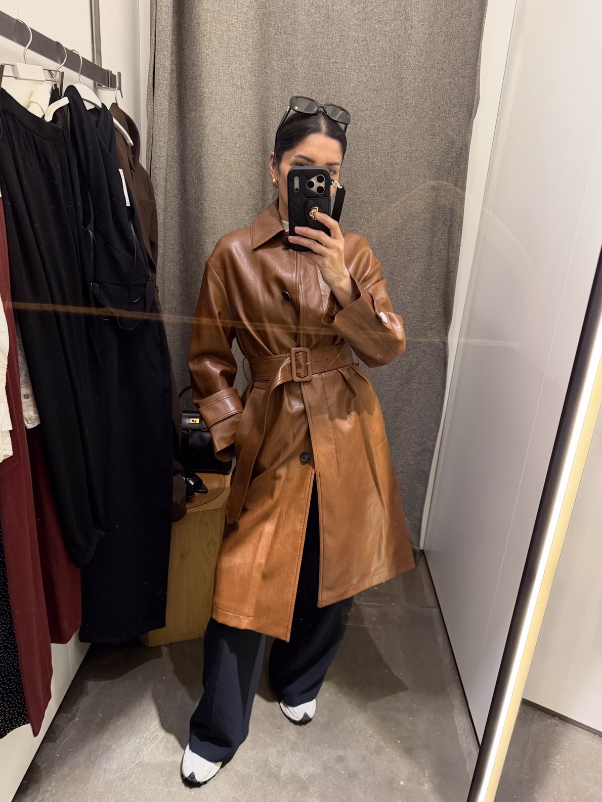 Office Outfit 5: Camel Faux Leather Trench + Black Trousers + New Balance 327